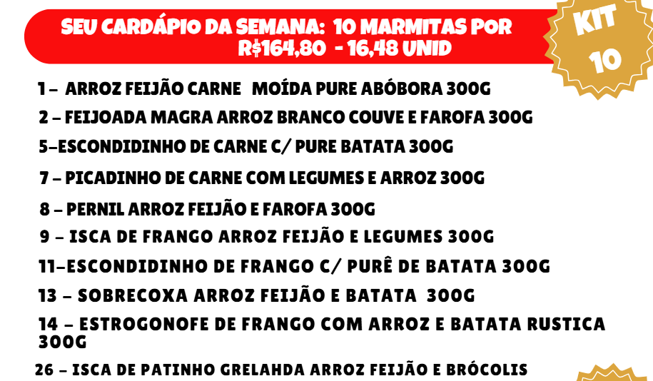 Com 1 unidade de cada uma das marmitas abaixo, você garante refeições equilibradas, feitas artesanalmente com ingredientes frescos e selecionados, mantendo o sabor caseiro e a qualidade superior.